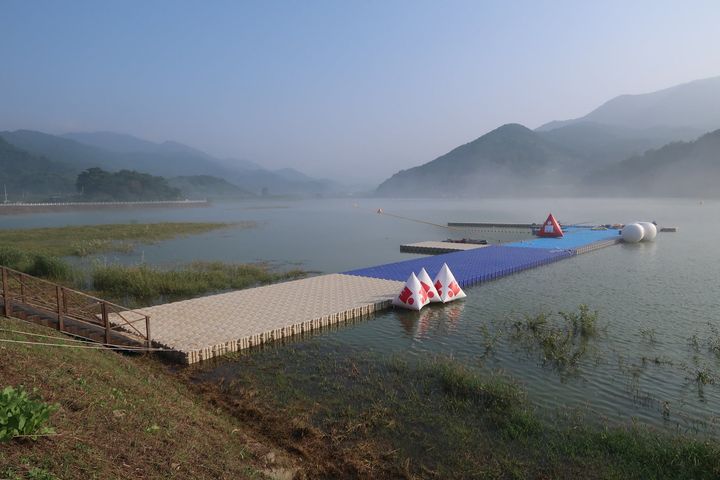 Auch am Wettkampf zeigte sich das Wetter von der besten Seite. Um 6:00 Uhr: 16 Grad, nahezu windstill – perfekte Bedingungen für einen planmäßigen Start fürs Schwimmen. Ein deutlicher Kontrast zum Vortag: Wegen des starken Wellengangs musste für die Age-Grouper und Junioren die Schwimmstrecke komplett in die geschützte Bucht verlegt werden.